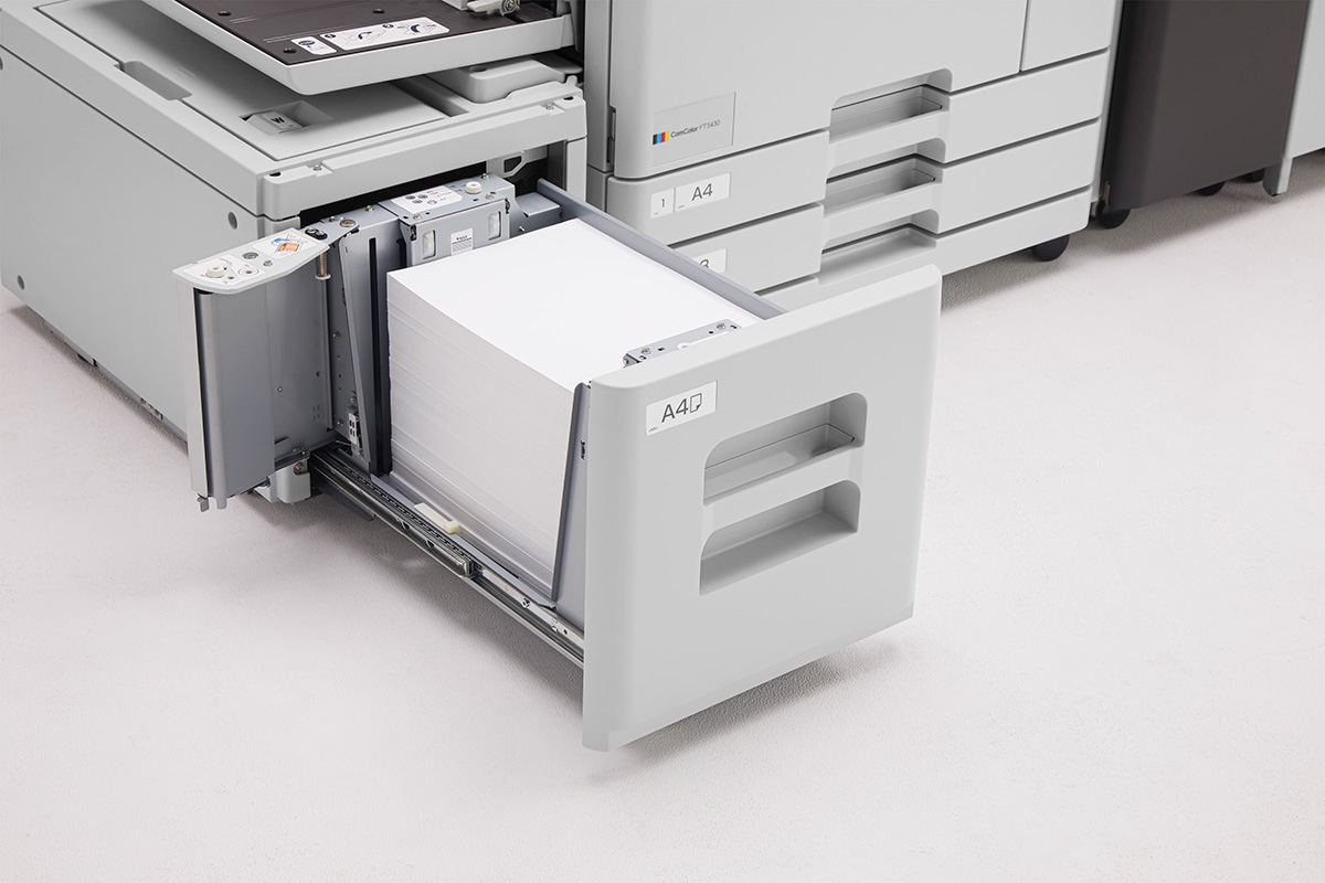 Rendimiento superior En la serie FT incorporamos un alimentador de papel opcional para satisfacer las amplias necesidades de los clientes aumentando sustancialmente la capacidad de alimentación en 2.000 hojas (formato A4), además de un nuevo finalizador con productividad mejorada y funciones enriquecidas.